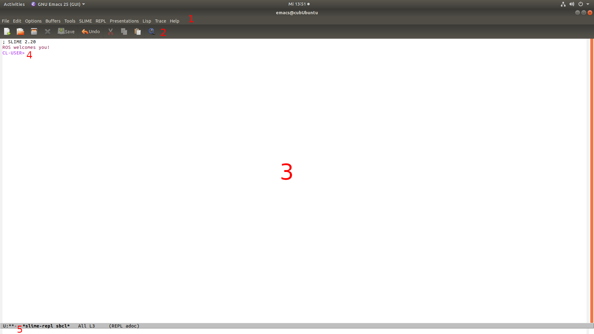 The main window currently occupies most of the screen (3). At the top of this window there's the prompt and cursor (4). The prompt (CL-USER>) also indicates, that the window's current buffer is the REPL. This can also be seen in the bottom bar just below the window (grey bar at marker 5). There it says “slime-repl sbcl”, which is the current buffer's name.