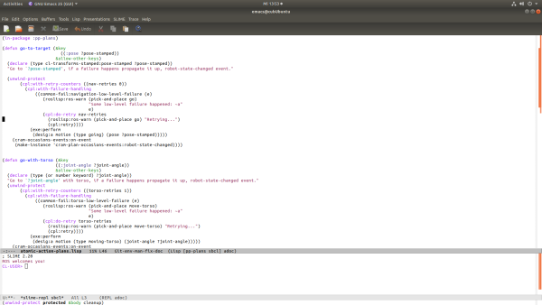 Using Emacs with CRAM is not all too different from using Emacs in any other LISP programming context. Here are some basic techniques to make your life easier when working with it.