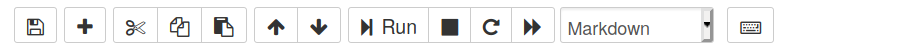 When the setup is finished your default browser should open the Notebook. In the browser, the filesystem of the Notebook is shown. Click on the Exercises.ipynb to get to the lecture's content. The following figure shows the toolbar of the Notebook.