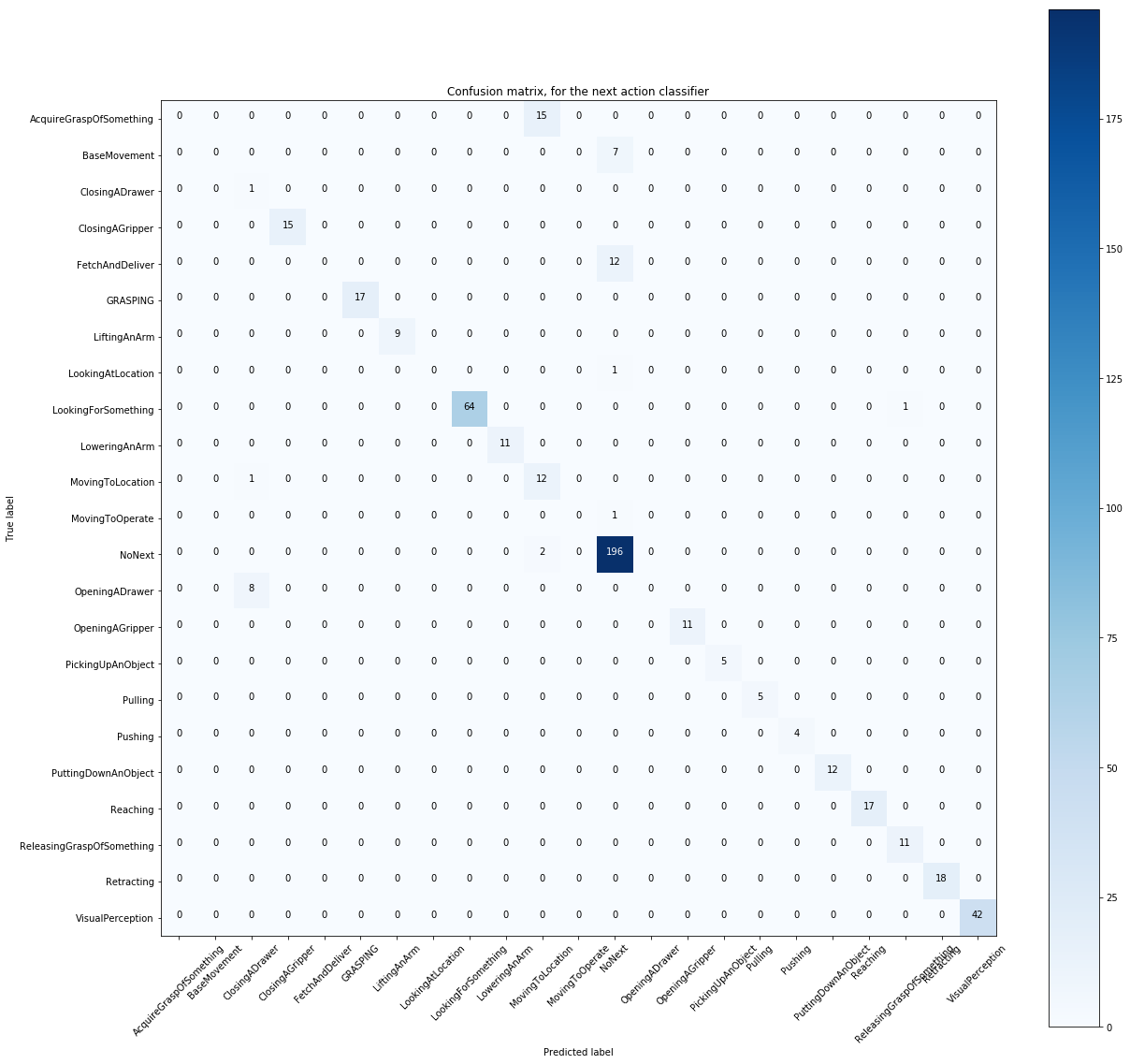 Along the rows we see the true classes, or what is expected to be predicted. In the columns are the classes predicted from our decision-tree model. Notice, that the most prominent and also correct prediction is NoNext, whereas the other classes line up pretty well along the optimal diagonal line. Some predictions are either falsely classified, or defaulted to NoNext.