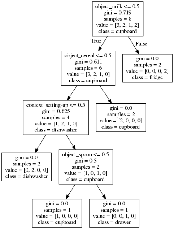 value = [3, 2, 1, 2] tells the sum of decidable goal locations over all objects, sorted like in the table above. [cupboard, dishwasher, drawer, fridge]. The further down we go along the tree, the more decisions have been made, and the fewer possibilities for a decision are left. So if the first node decides, the object is not milk, the predicted goal location will never be fridge, since no other object than milk is going to the fride, an therefore the last entry of this array of numbers is going to be 0 for all upcoming nodes.