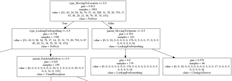 1. Say, the type of action we currently try to predict something for is MovingToLocation (value higher than 0.5). From the root node we would go down the right branch (false), since type_MovingToLocation <= 0.5 is false. 2a. The next decision to be done is based on whether the parent is MovingToOperate and let's say it is not (value below 0.5). Also recognize, that the class entry on the node changed to LookingForSomething, since this is the most likely next action so far. When parent_MovingToOperate <= 0.5 evaluates to true the branching goes on to the left, finally hitting a leaf node. 3a. The model predicts, when the type of action is MovingToLocation and its parent is not MovingToOperate, the most likely next action to follow will be LookingForSomething since this is the only entry in the value list.