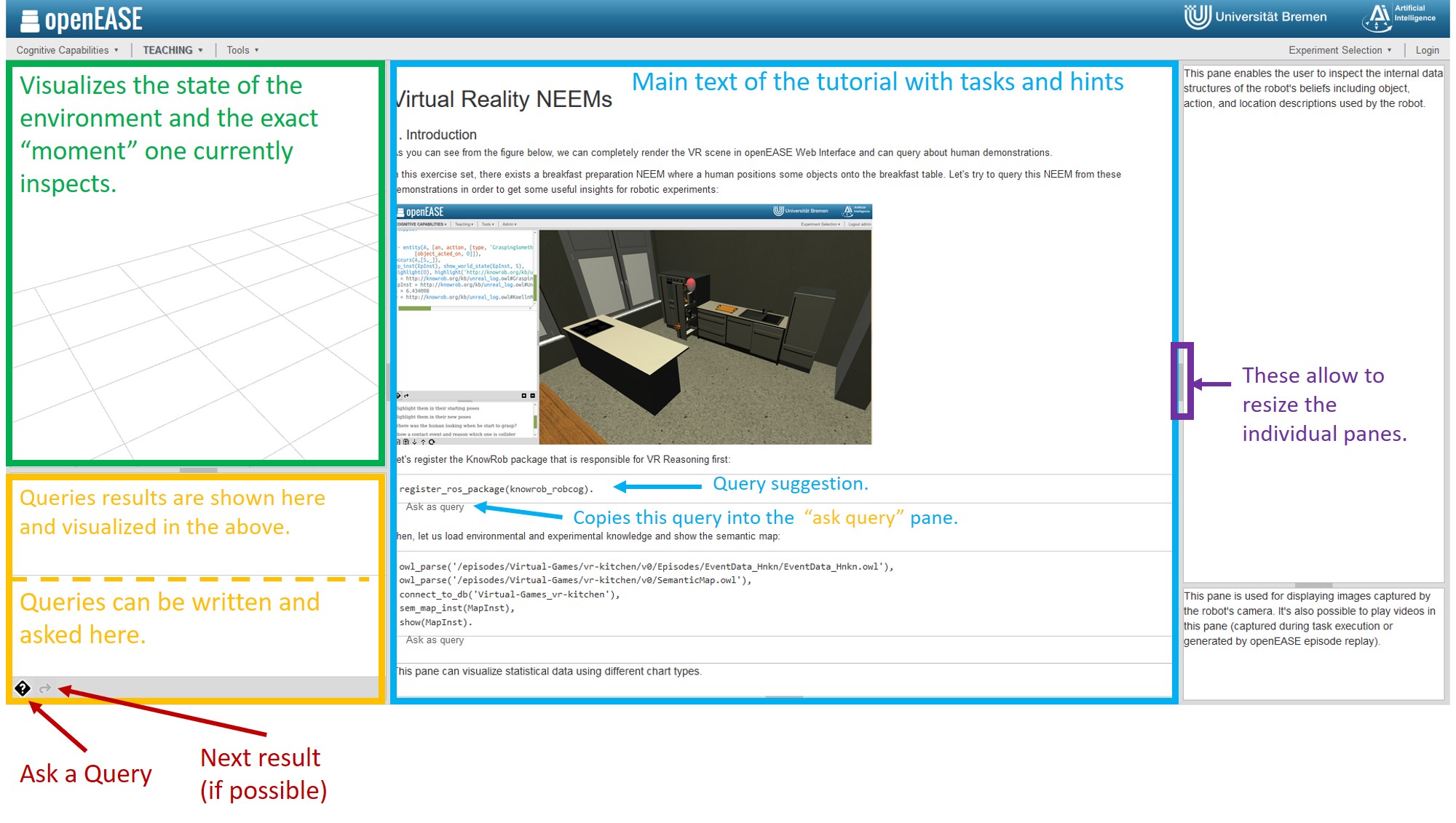 The following description comments on the build-in Virtual Reality NEEMs Tutorial within OpenEase, by trying to explain in more detail what certain queries do and why they are used the way they are. You can of course try to complete the Tutorial on your own without the information which is provided here. It's up to you.