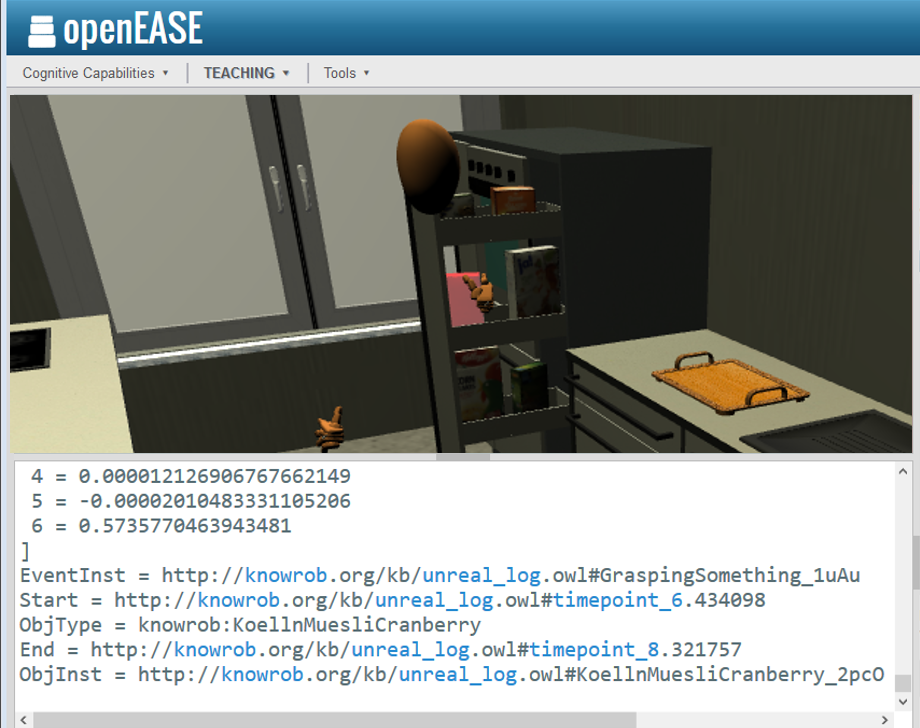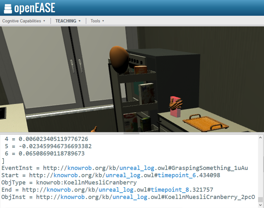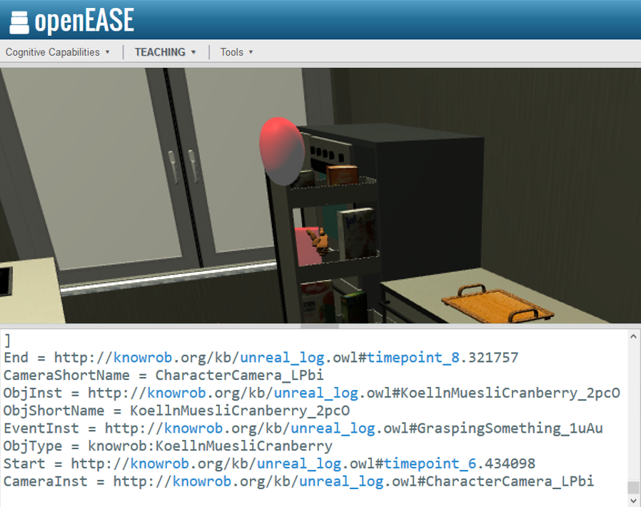 Before we can teach the robots though, we have to understand what kind of data is being recorded and how we can access and inspect it, before we decide which parts of it to pass on to the robots. This tutorial will aim at teaching how to interact with episodic memories and inspect the data stored within using Open Ease and Prolog queries.